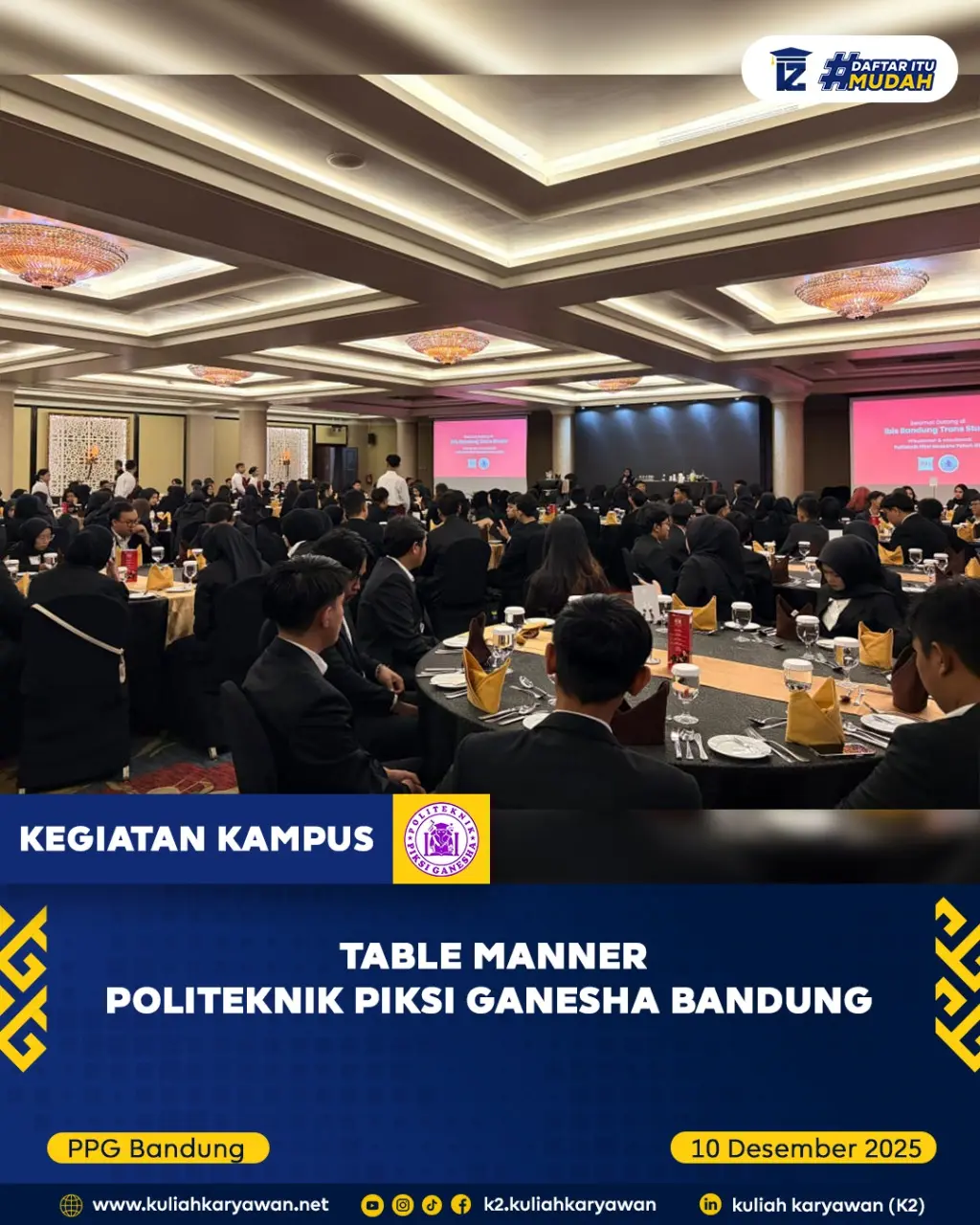 Tanggal 10 Desember 2025, Politeknik Piksi Ganesha Bandung menyelenggarakan kegiatan Table Manner sebagai bagian dari program pembekalan mahasiswa dal......