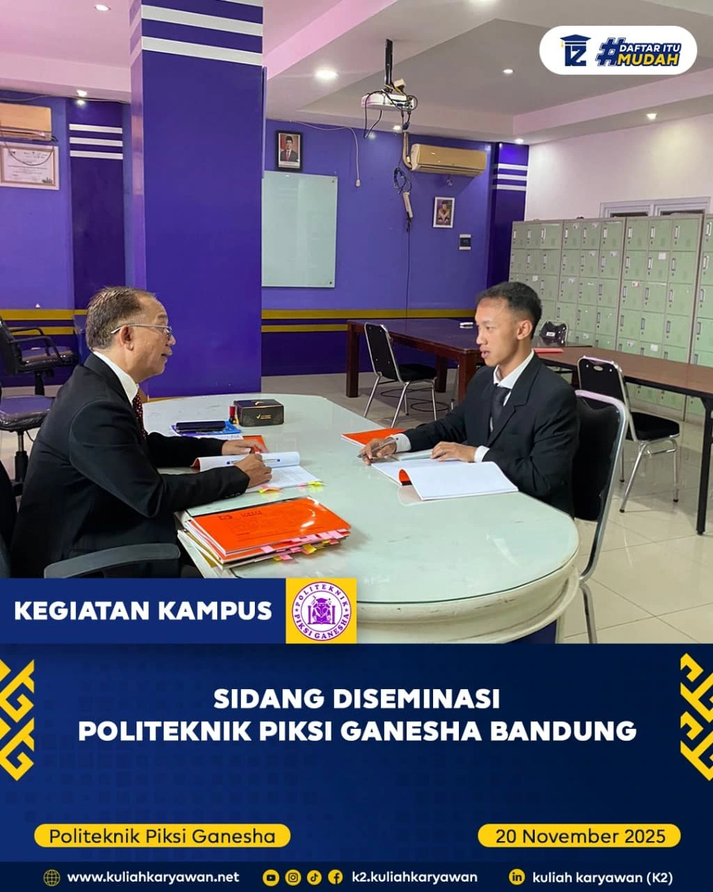 Sidang Diseminasi Politeknik Piksi Ganesha Bandung pada 20 November 2025 berlangsung dengan tertib dan formal. Kegiatan ini menjadi proses evaluasi ba......